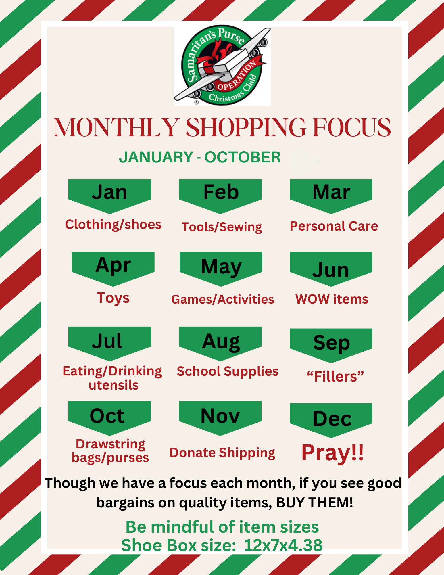 Serve with us all year! Community , Neighbors, Members & Friends!!! This mission is to send shoebox -filled Christmas gifts around the world to share the love and the good news of Jesus Christ!